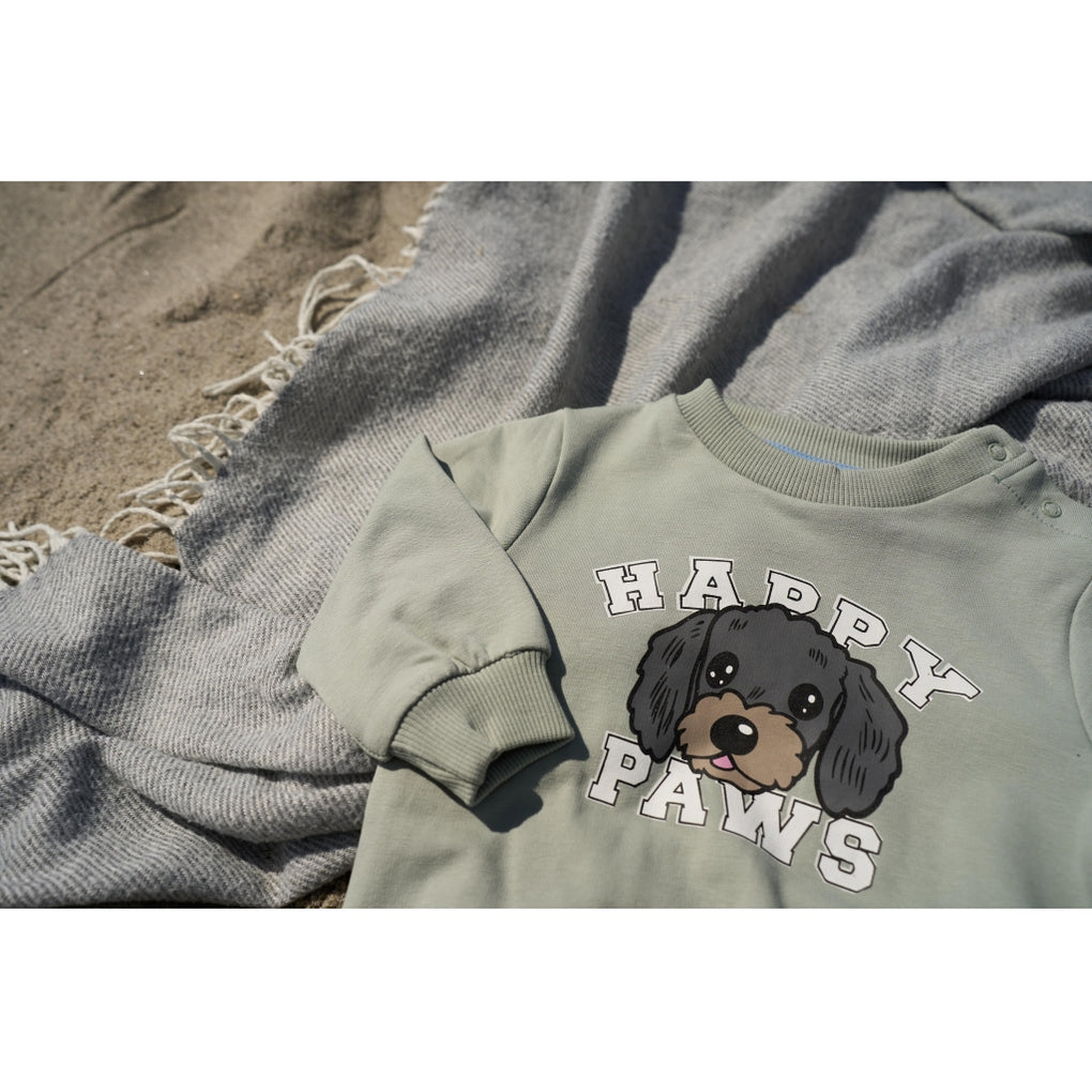 Denne sweatshirt til baby dreng har en normal pasform med lange ærmer og rund hals. Modellen har trykknapper på den ene skulder, som gør af- og påklædning lettere. Foran ses et print med teksten “HAPPY PAWS” og en hundegrafik. Ribkanter ved hals, ærmer og nederste kant giver et velafsluttet look. Materialet er 95% bomuld og 5% elastan, som giver let stræk og fungerer godt til lag-på-lag i hverdagen.