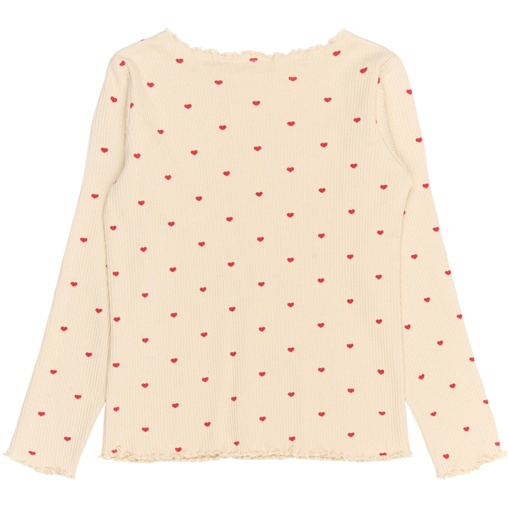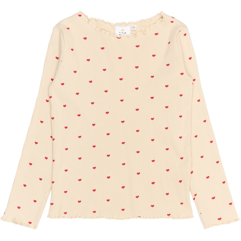 Denne langærmede T-shirt fra THE NEW er både sød og feminin med sit fine all-over print af små røde hjerter. Den har en tætsiddende pasform og er designet med babylock ved kanter om hals, ærmer og bund, som giver et charmerende og legende udtryk. Perfekt som et blødt og behageligt lag til både hverdag og hyggelige stunder.