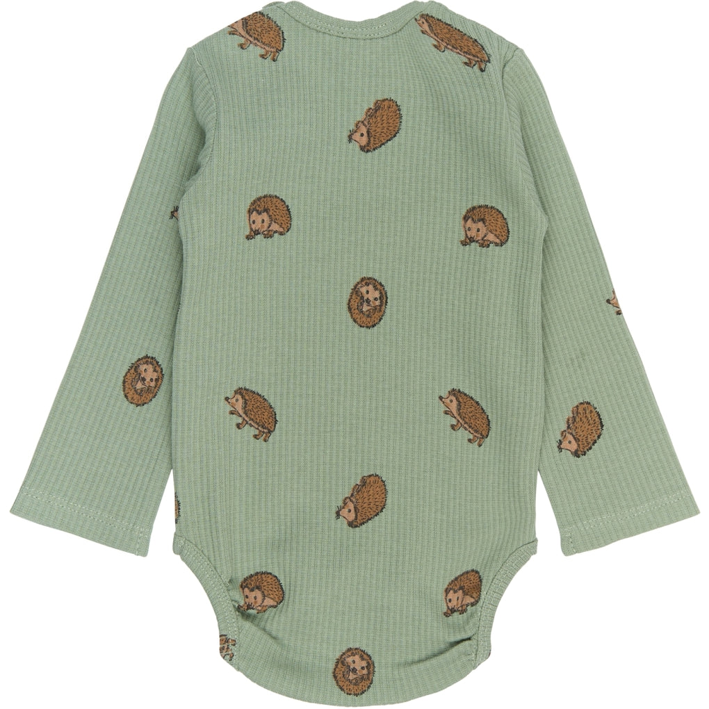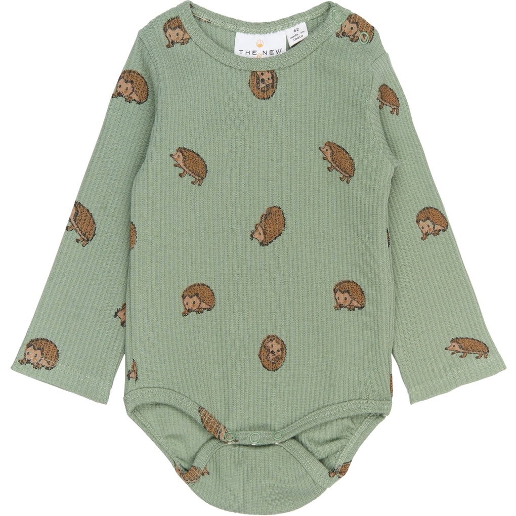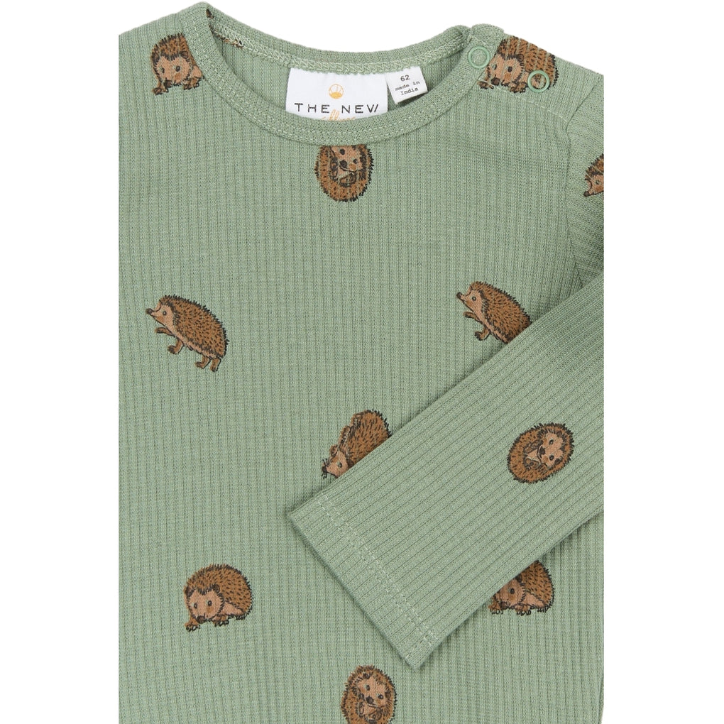 Denne langærmede body fra THE NEW Siblings er både blød og funktionel med et charmerende all-over print af små pindsvin. Den tætsiddende pasform og de praktiske trykknapper ved skulder og bund gør den nem at tage af og på – perfekt til både hverdag og leg. Et sødt og komfortabelt valg til de mindste.