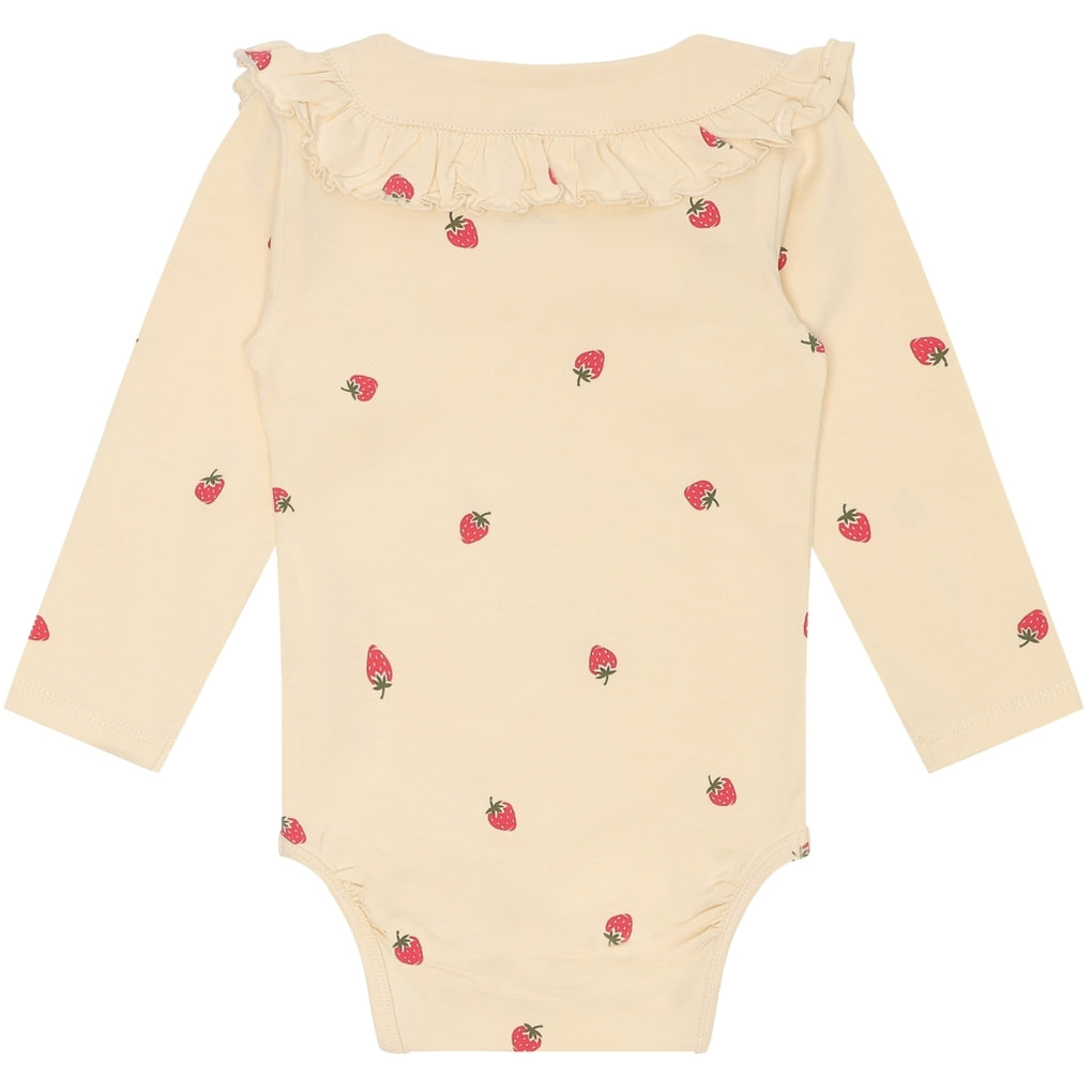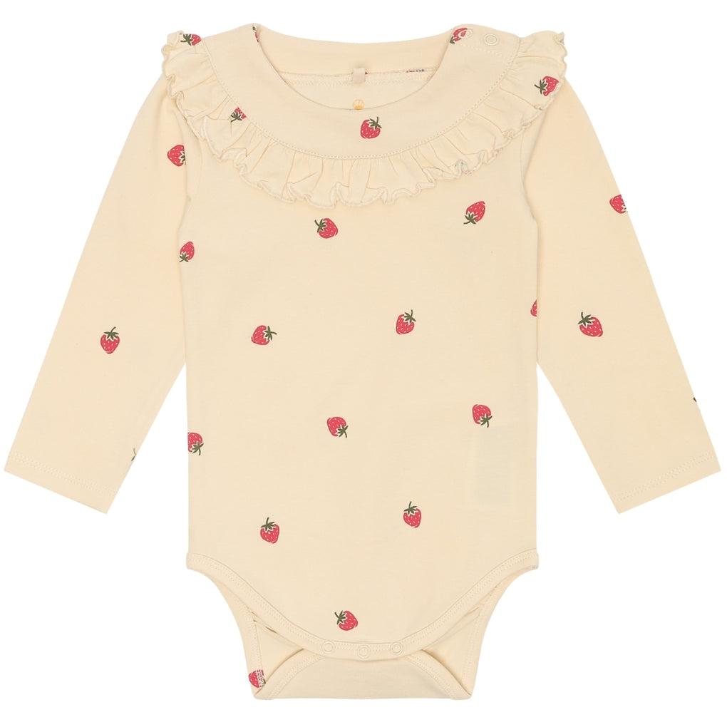 Langærmet baby bodystocking med søde jordbær på. Denne søde body fra THE NEW siblings er lavet af økologisk bomuld, for at undgå skadelige kemikalier og gøre den blød og åndbar. Vi har også tilføjet 5% stræk, så dit barn har frihed og komfort til leg og udforskning af verden. Kombiner evt. med de matchende TNSLarawila bukser for et sødt sæt