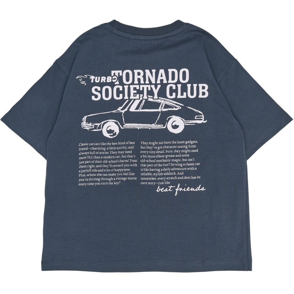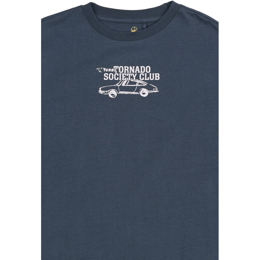 Denne kortærmede T-shirt til drenge er lavet i 100% økologisk bomuld. Den har rund hals og et lige, afslappet snit, som giver en enkel pasform. Foran sidder et mindre brystprint med bilmotiv og teksten “Tornado Society Club”. Den er let at style med jeans eller shorts og kan også bruges som lag under en åben skjorte eller trøje. En alsidig basisstyle til hverdagsbrug i de varmere måneder eller året rundt med lag.