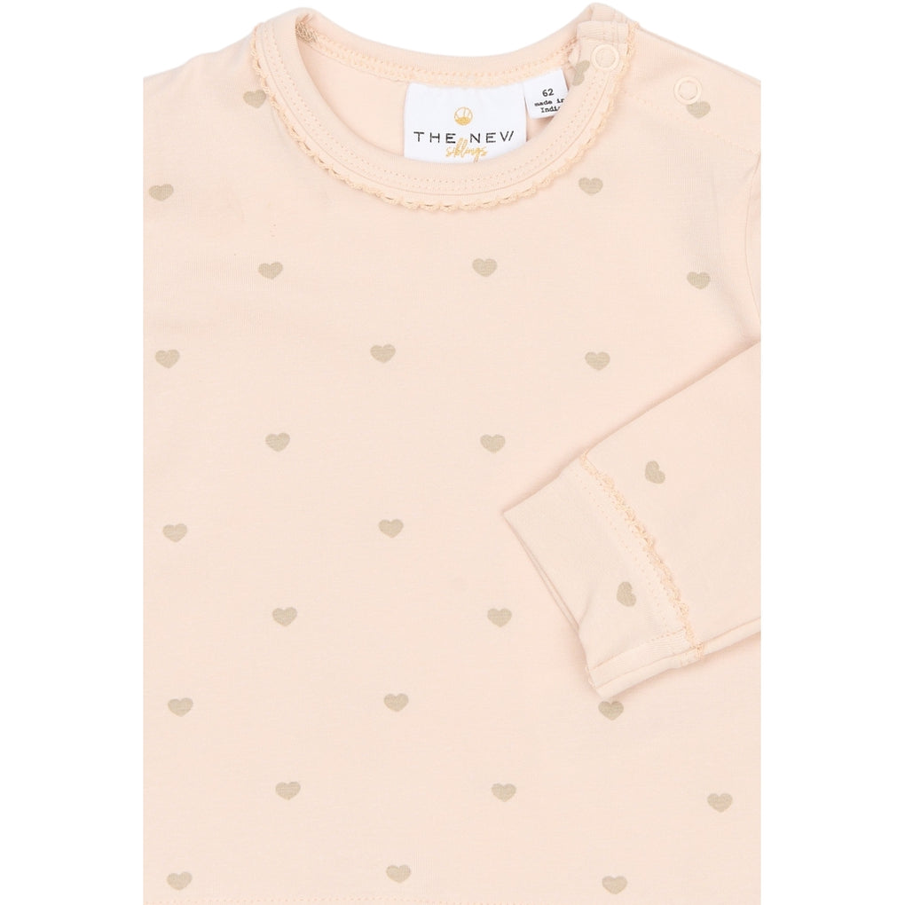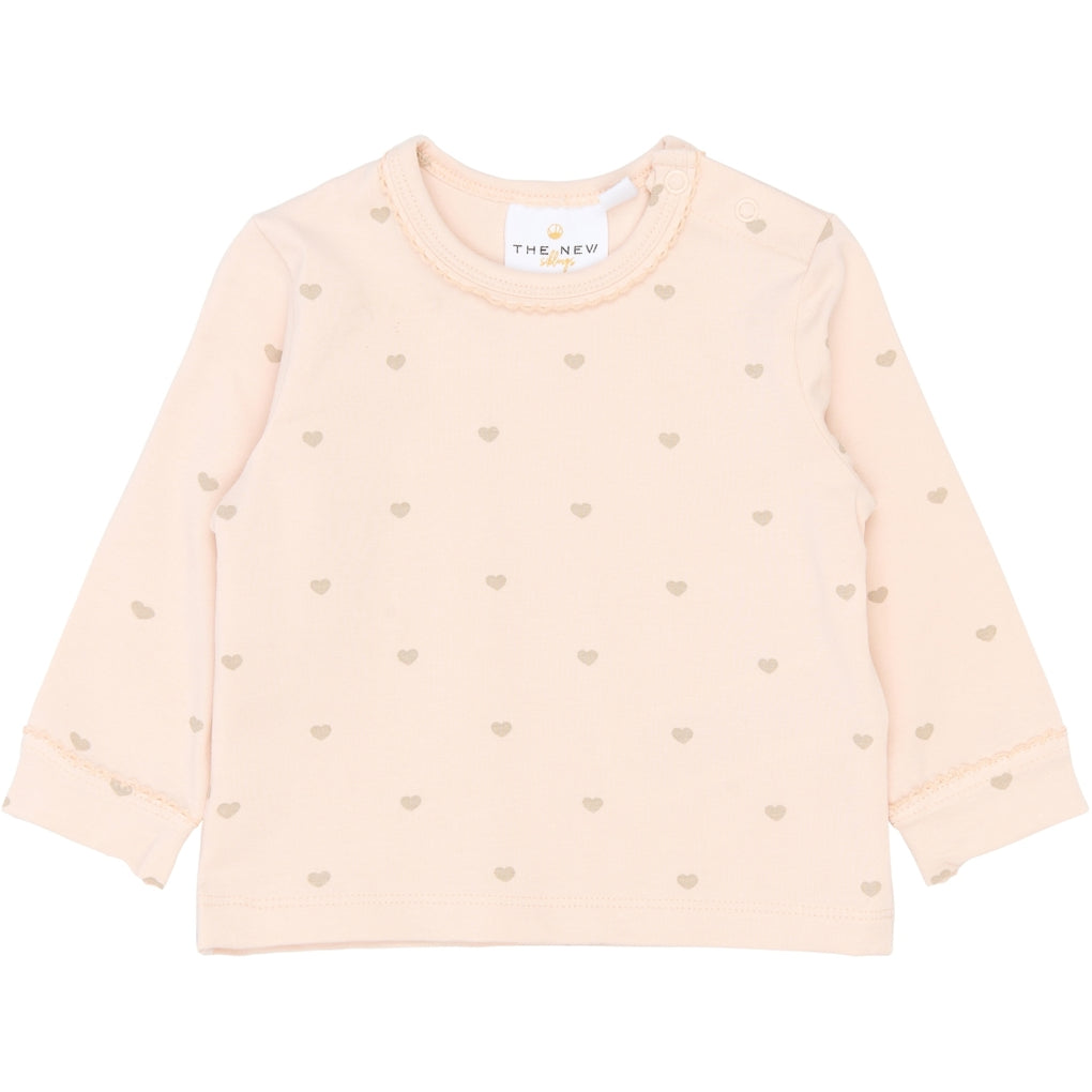 Denne langærmede T-shirt til baby har et enkelt, lige snit og en rund hals. Modellen er i 95% bomuld og 5% elastan, hvilket giver en blød og let strækbar kvalitet. Halsudskæringen har trykknapper ved skulderen, som gør det nemt at få trøjen af og på. Der er små synlige bølgekanter ved hals og ærmeafslutninger samt et allover print med små hjerter. Den lange ærmelængde gør den velegnet til lag-på-lag og den er nem at style med leggings, bukser eller nederdele i hverdagen.