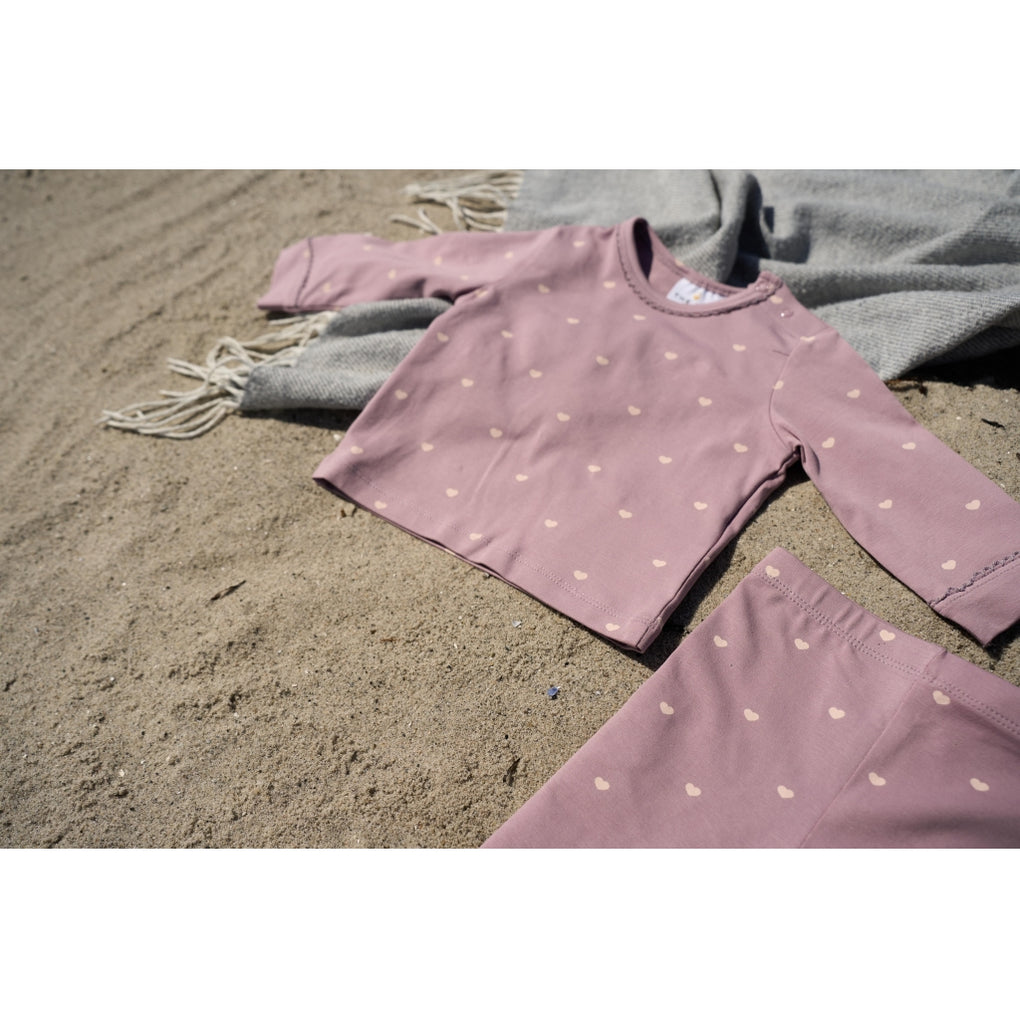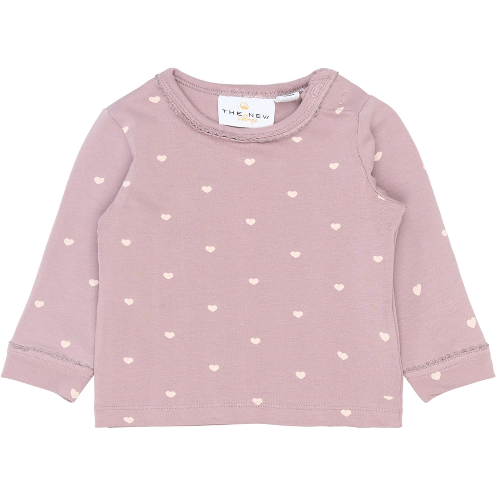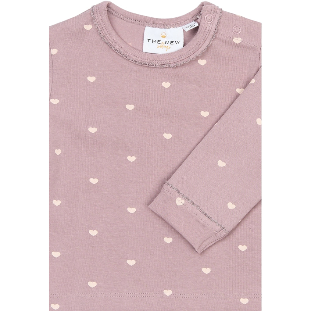 Denne langærmede T-shirt til baby har et enkelt, lige snit og en rund hals. Modellen er i 95% bomuld og 5% elastan, hvilket giver en blød og let strækbar kvalitet. Halsudskæringen har trykknapper ved skulderen, som gør det nemt at få trøjen af og på. Der er små synlige bølgekanter ved hals og ærmeafslutninger samt et allover print med små hjerter. Den lange ærmelængde gør den velegnet til lag-på-lag og den er nem at style med leggings, bukser eller nederdele i hverdagen.