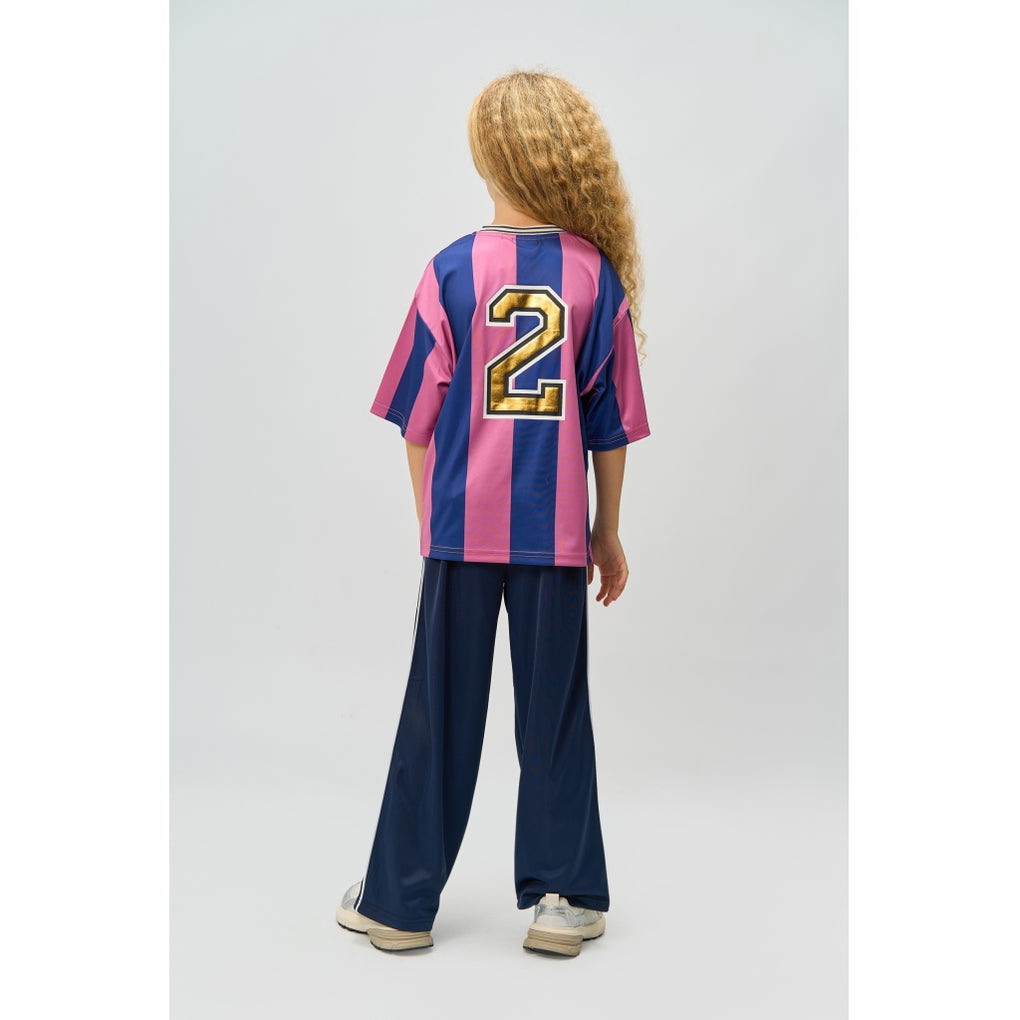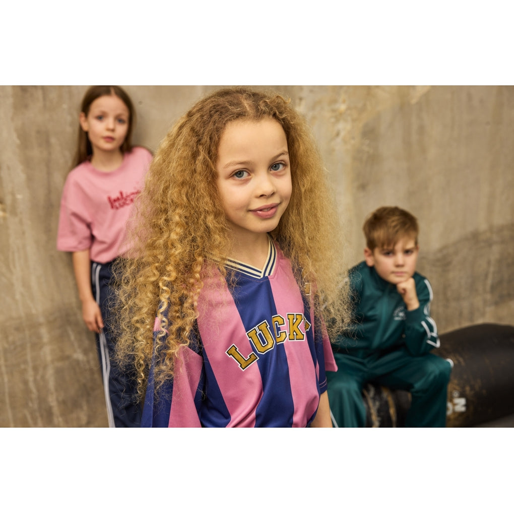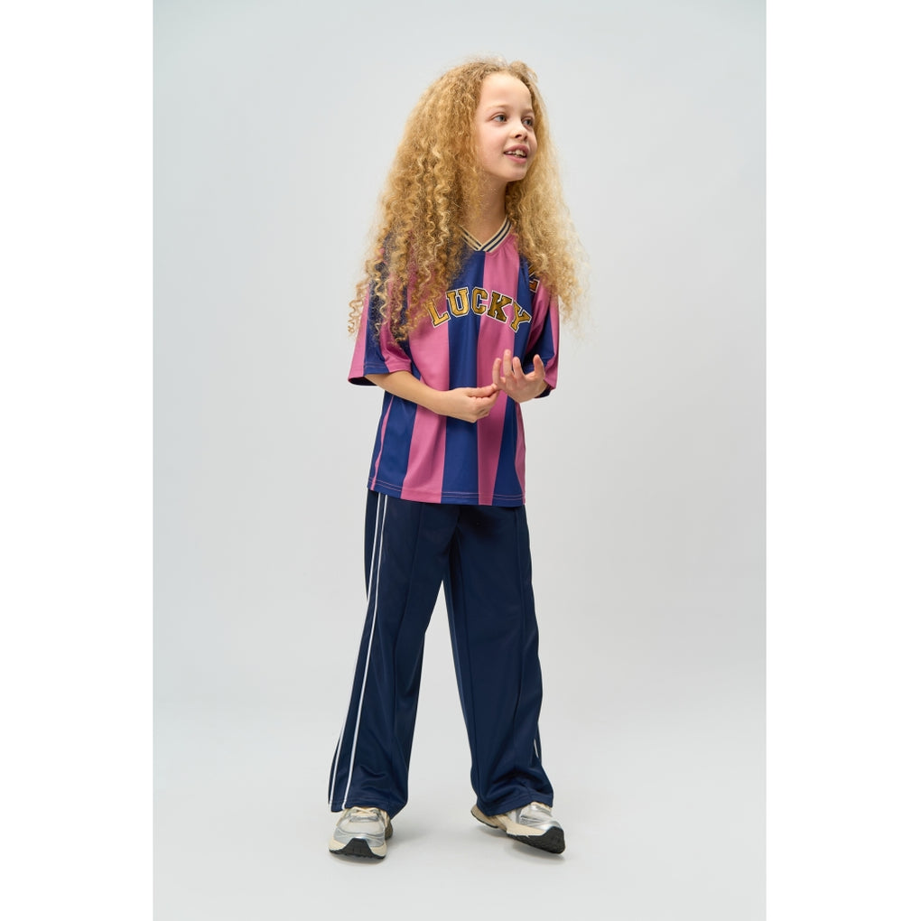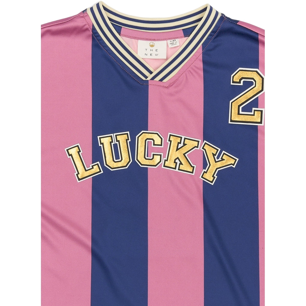 Sporty og trendy T-shirt fra THE NEW med brede striber i en flot farvekombination. Trøjen har en afslappet pasform med en klassisk V-hals og kontraststribede ribdetaljer, der giver et autentisk sportsligt udtryk. På brystet står "LUCKY" i et markant design, og et flot guld-tal "2" er placeret på skulderen. Bagsiden prydes af et stort 2-tal i guld, der fuldender det sporty look. Perfekt til både hverdagsbrug og en cool, afslappet stil.