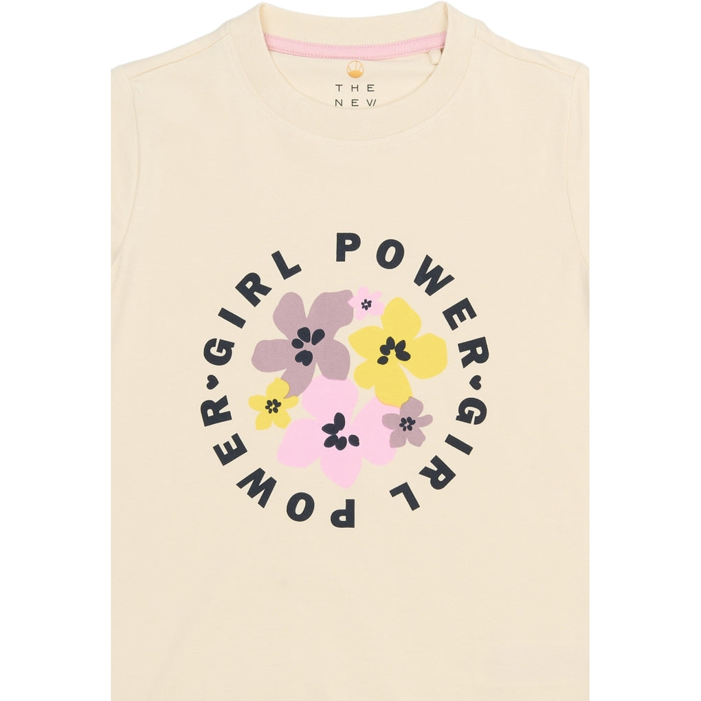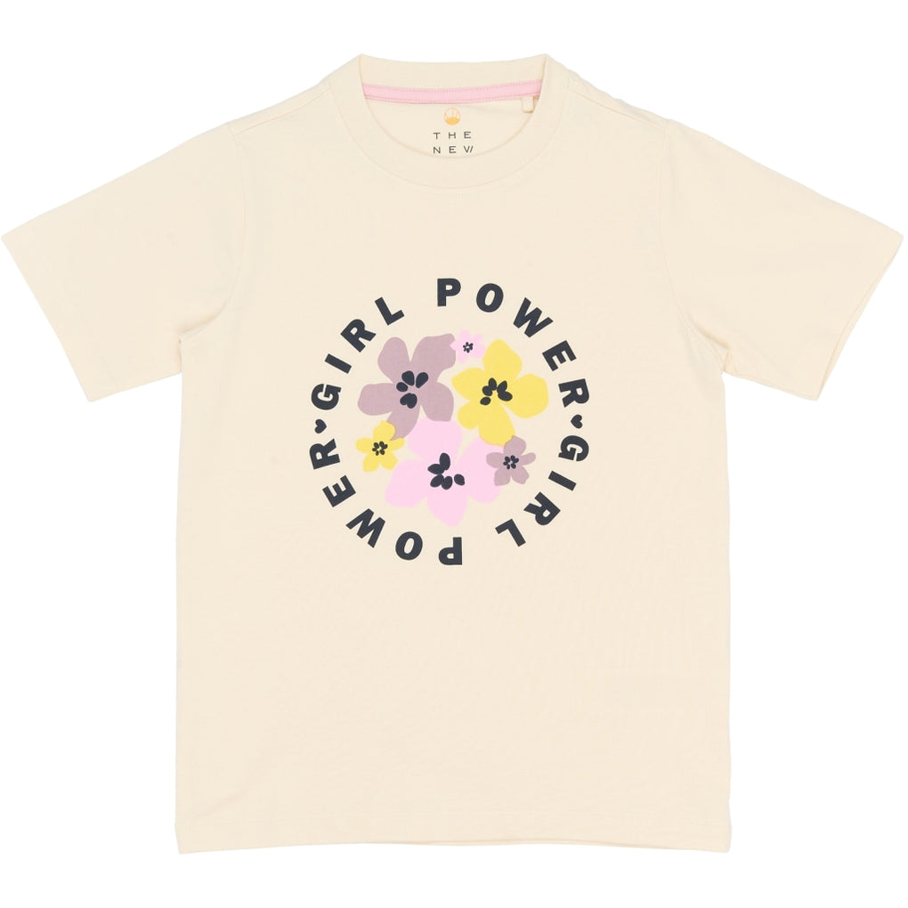 TNSamara S_S Tee fra THE NEW er en kortærmet T-shirt til piger med rund hals og en lige, klassisk pasform. Modellen er fremstillet i 95% bomuld og 5% elastan for en blød fornemmelse og let stræk. Foran har den et centralt print med teksten GIRL POWER i en cirkel omkring blomster. Den enkle form gør den nem at style til hverdagen og skole. Brug den alene i varmere vejr eller som lag under cardigan og jakke.