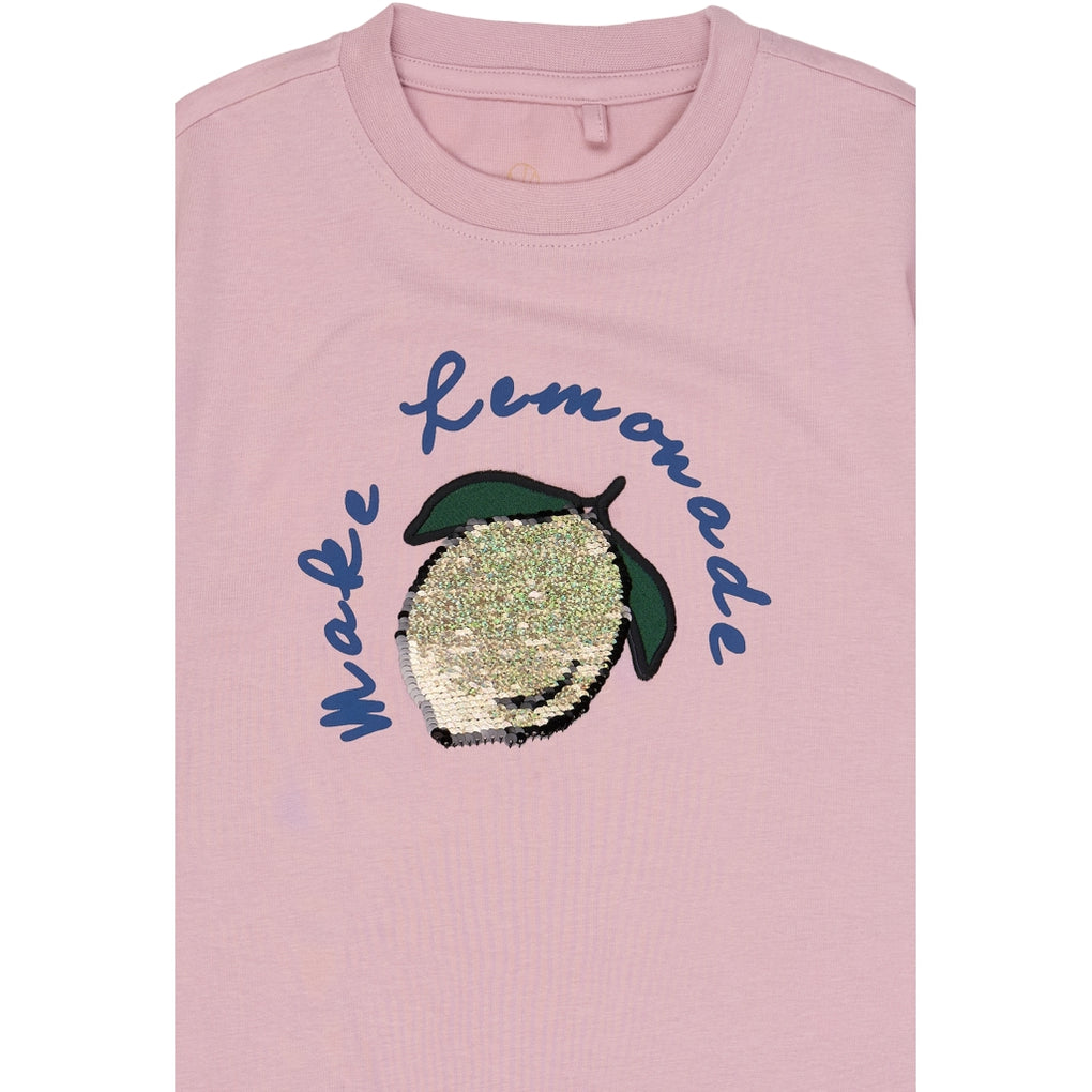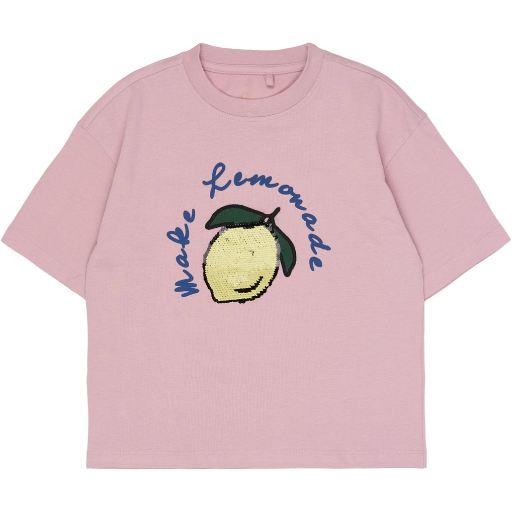 Denne lyserøde T-shirt er skabt til glade sommerdage med sin afslappede, oversize pasform og bløde fornemmelse mod huden. Den er lavet i 100% økologisk bomuld, som føles let og behagelig, og som giver god åndbarhed hele dagen. Foran prydes den af et legende “Make Lemonade”-print med glitrende pailletter, der giver et frisk og sjovt udtryk. Den runde hals og de korte ærmer gør den nem at bruge både til skole og i fritiden. Style den med shorts, jeans eller en nederdel for et cool hverdagslook.