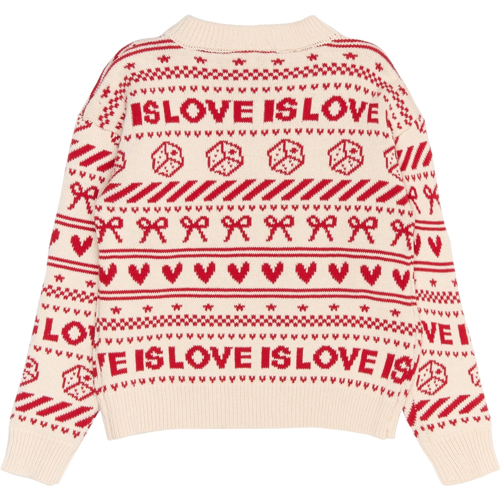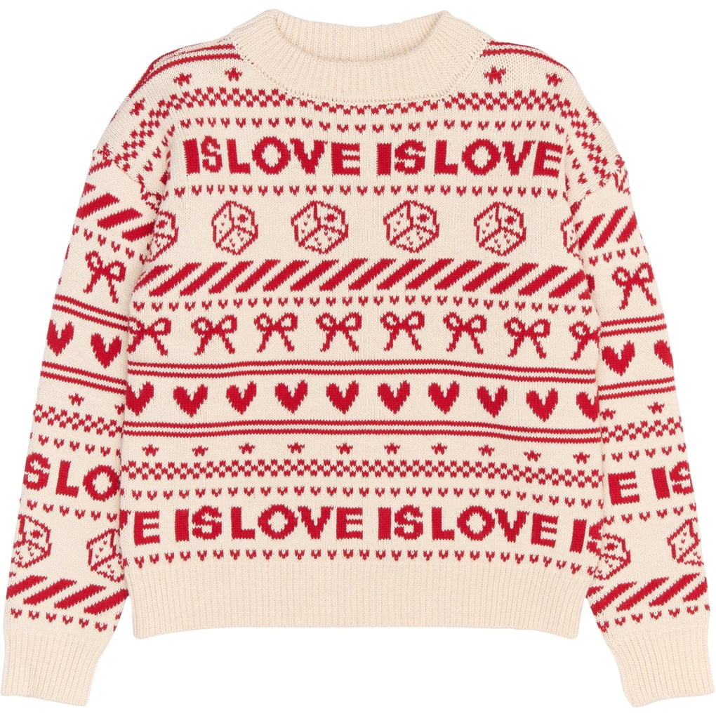 Omfavn både varme og stil med denne smukke jacquard pullover fra THE NEW. Strikken er i en elegant flødefarvet nuance og prydet med unikke røde detaljer, der skaber et legende og iøjnefaldende design. Med et smukt mix af mønstre – terninger, sløjfer, striber, hjerter og tern – samt den inspirerende tekst *"Love is love"*, forener denne pullover et cool statement med tidløs komfort. Den bløde kvalitet sikrer en behagelig pasform, mens det detaljerige jacquardstrik tilføjer et eksklusivt touch. Perfekt til at give dit outfit et strejf af personlighed og varme på kølige dage.