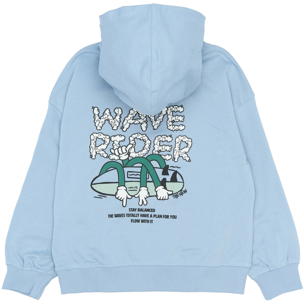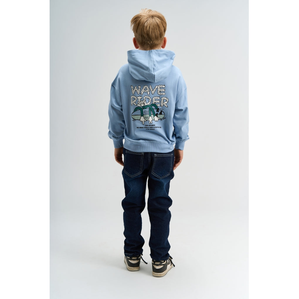 Denne sweatshirt med hætte til drenge er lavet af 100% økologisk bomuld og har en blød, behagelig overflade. Modellen har en afslappet pasform med sænkede skuldre, som giver god bevægelsesfrihed. Foran sidder en kængurulomme, og ærmer samt bund afsluttes med ribkanter for en stabil pasform. På venstre bryst er der et lille print med surfbræt og teksten “Wave Rider”. Velegnet til hverdagen og fungerer godt som et ekstra lag over T-shirts.