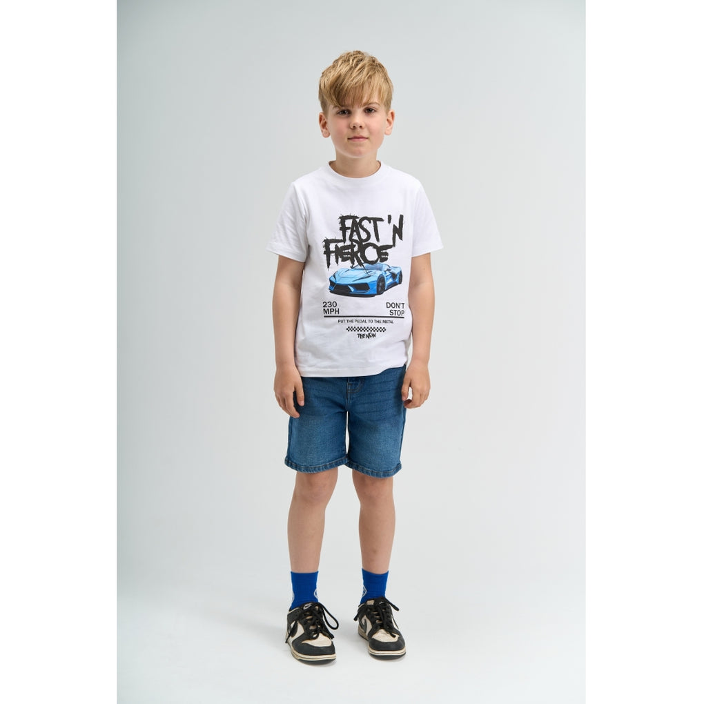 Denne kortærmede T-shirt til drenge har rund hals og en front med stort bilmotiv og racerinspireret tekst. Materialet består af 95% bomuld og 5% elastan, hvilket giver fleksibilitet i stoffet. Den enkle pasform gør den nem at bruge alene eller som lag under en hoodie eller jakke. Den er let at style med shorts, jeans eller sweatpants til skole og fritid. Kan bruges året rundt som basisdel i garderoben.