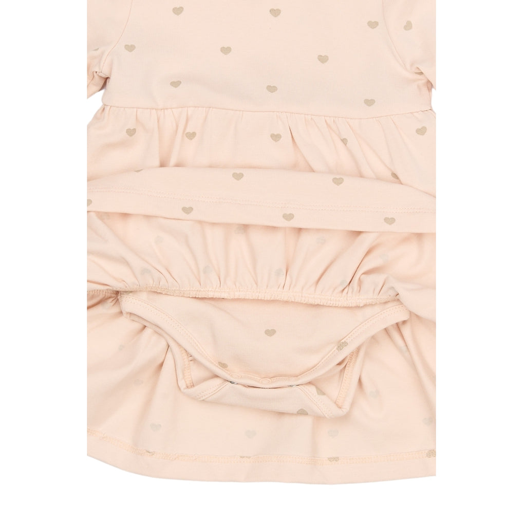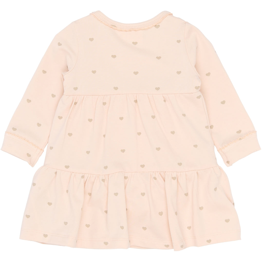 Denne langærmede kjole til baby pige er lavet i en strækbar bomuldsblanding for en behagelig pasform til hverdagen. Modellen har rund hals med trykknapper på den ene skulder, som gør påklædningen enkel. Hals- og ærmekanter er afsluttet med picotkant for et pænt udtryk. Kjolen har allover hjerteprint og et rynket, todelt skørt, der giver et let fald. Nem at kombinere med strømpebukser eller leggings og fungerer godt i lag med en body eller cardigan.