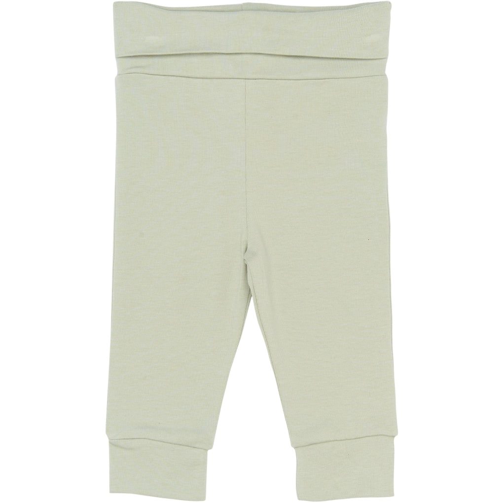 Disse baby-unisex bukser har et enkelt, ensfarvet udtryk i en lys grøn tone. Modellen er lavet i 95% økologisk bomuld og 5% elastan, som giver let stræk og en tættere pasform. Den brede, foldbare taljekant giver mulighed for at justere højden, så bukserne sidder godt. Buksebenene er smalle og afsluttes med ribmanchetter ved anklerne. De er nemme at kombinere med bodyer og bluser og fungerer godt til lag-på-lag året rundt.