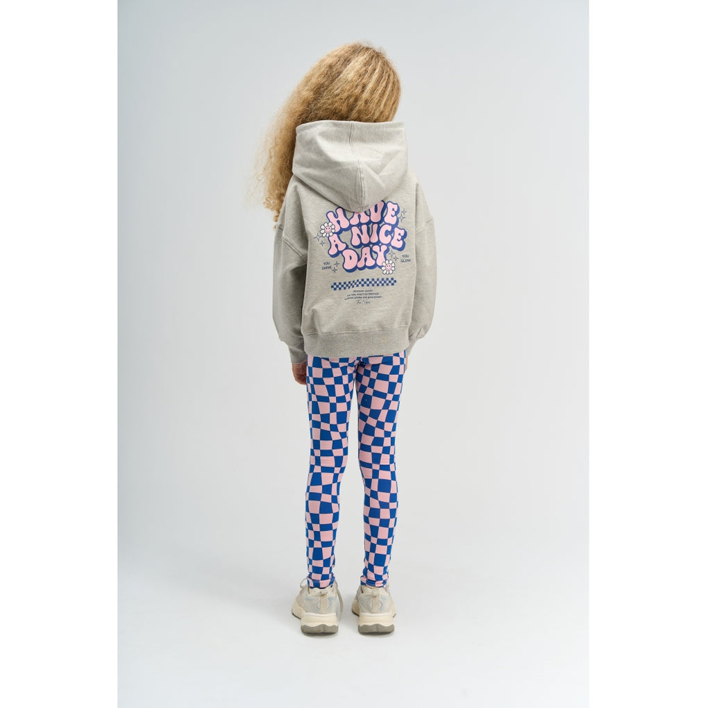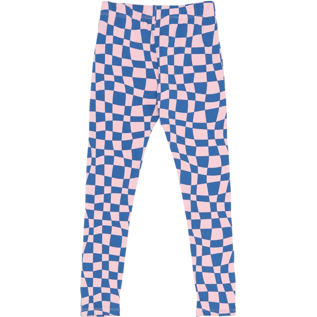 Disse leggings til piger har et bølget skakternet allover-print i blå og rosa. Modellen er fuldlængde med smalle ben og en elastisk talje, der giver en fleksibel pasform. Der er synlige sømme ved ankler og talje for et rent udtryk. Materialet består af 95% økologisk bomuld og 5% elastan med stræk. De er lette at kombinere med T-shirts, tunikaer eller kjoler og fungerer godt til lag-på-lag.