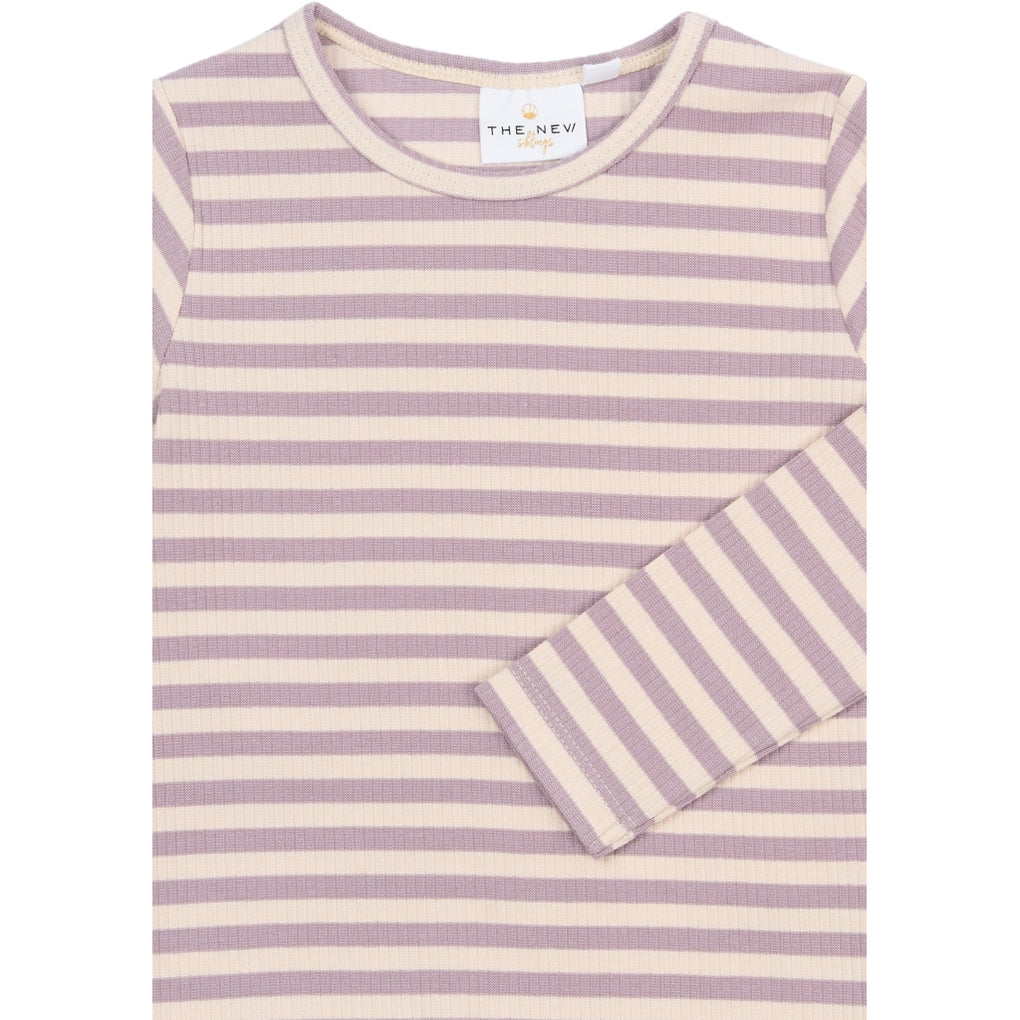 Denne langærmede T-shirt til tumlinge har en ribbet struktur med vandrette striber. Modellen har rund hals og lige bundkant, og den strækbare kvalitet gør den nem at tage af og på. Stoffet består af 95% bomuld og 5% elastan, som giver let stræk og god bevægelsesfrihed. Den kan bæres alene eller som lag under trøjer og jakker i køligere vejr. Unisex design, der er let at style med bukser, shorts eller nederdele.