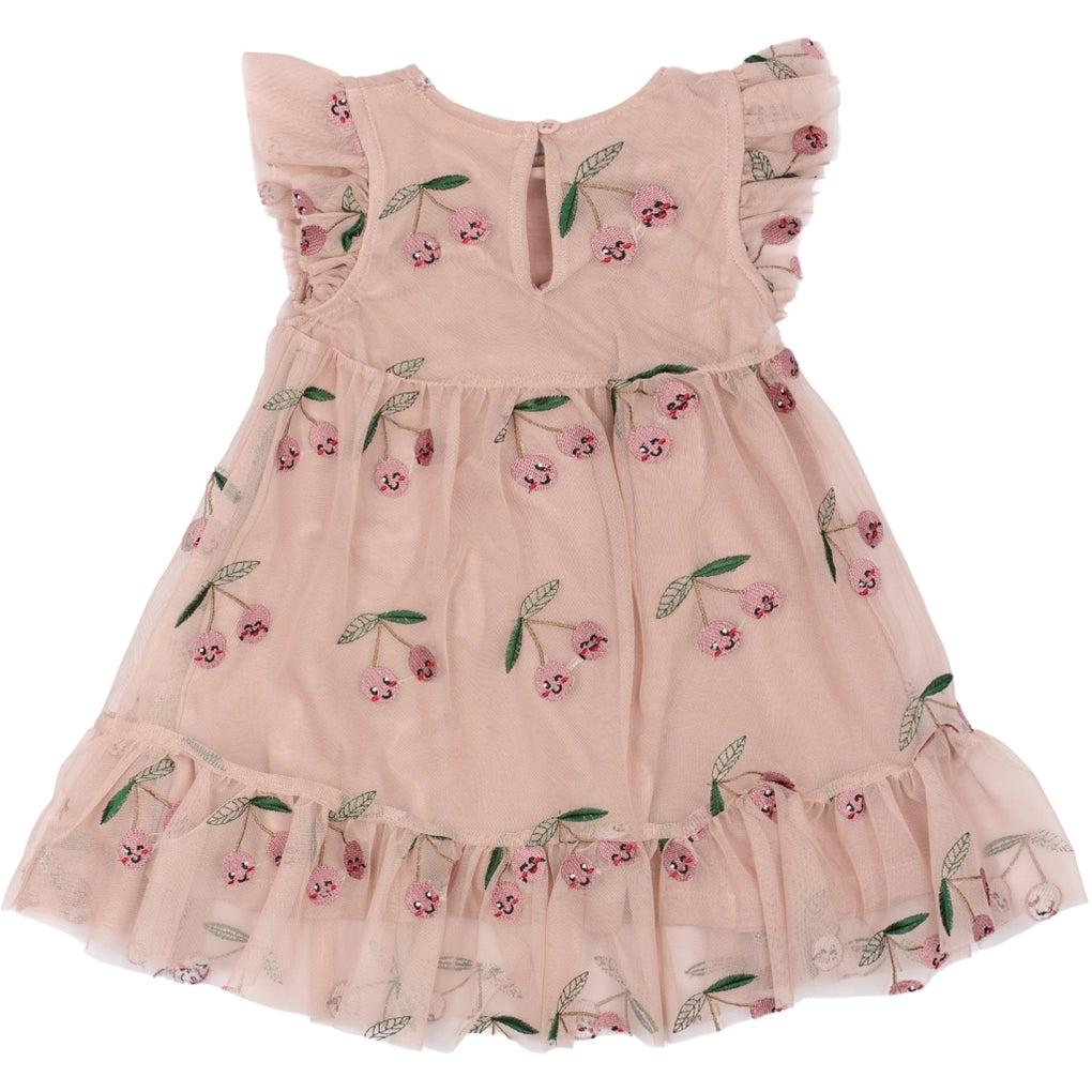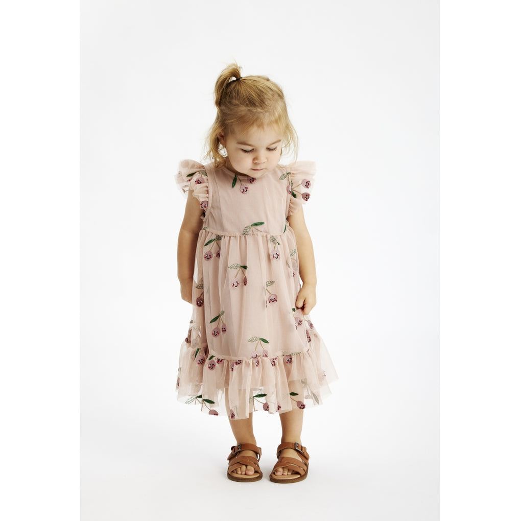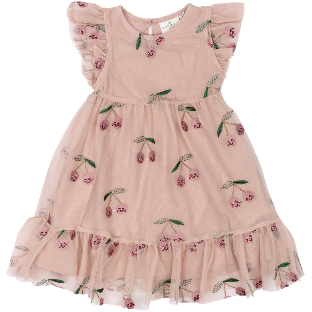 Fortryllende mesh-kjole fra THE NEW siblings. Den vil med garanti begejstre enhver lille pige og få hende til at stråle. Denne charmerende kjole i to lag består af en underkjole i blødt og åndbart bomuld, samt et ydre lag af blødt, gennemsigtigt mesh-stof med broderier af smilende kirsebær. Det er den perfekte festkjole til særlige anledninger.