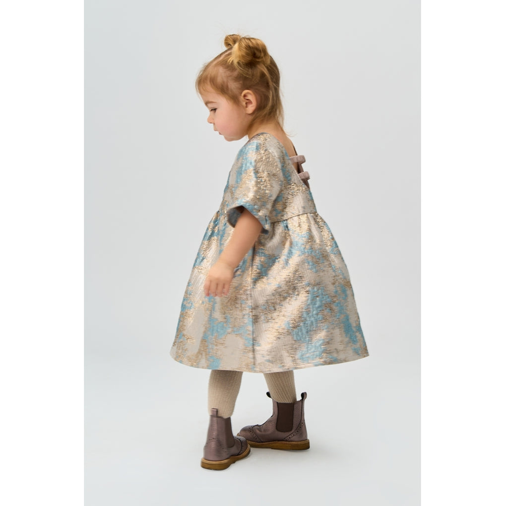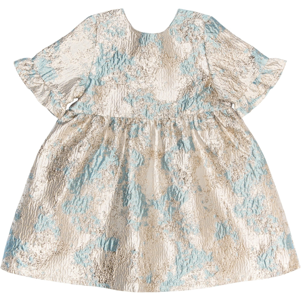Denne kjole fra THE NEW Siblings er en virkelig elegant style, der er perfekt til særlige lejligheder. Den er lavet i smukt jacquardstof med et skinnende blomsterprint og har en vid A-formet pasform med let volumen og korte flæseærmer, som tilføjer et raffineret og festligt udtryk. Kjolen er både stilfuld og behagelig, så de små kan stråle og samtidig bevæge sig frit og lege.
